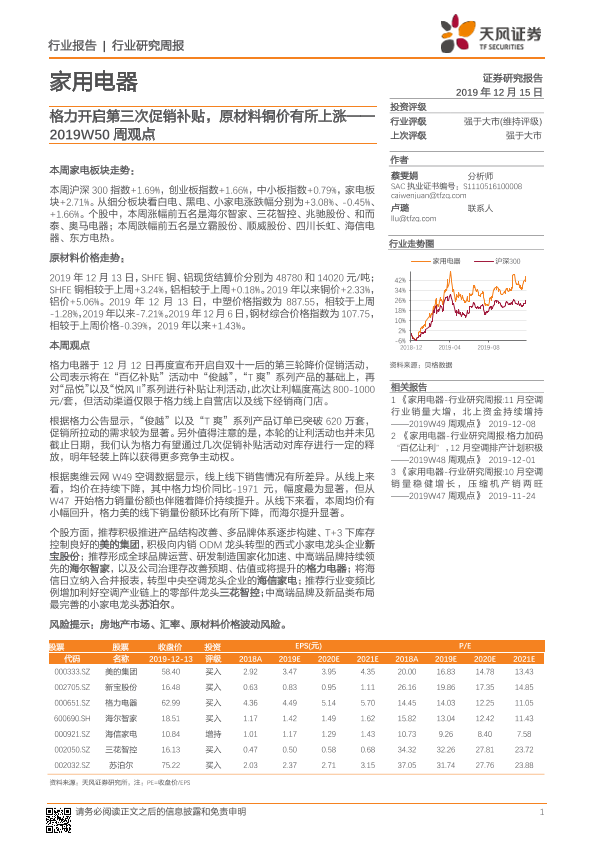 【天风证券】【20191215】家用电器2019W50周观点:格力开启第三次促销补贴,原材料铜价有所上涨-13页