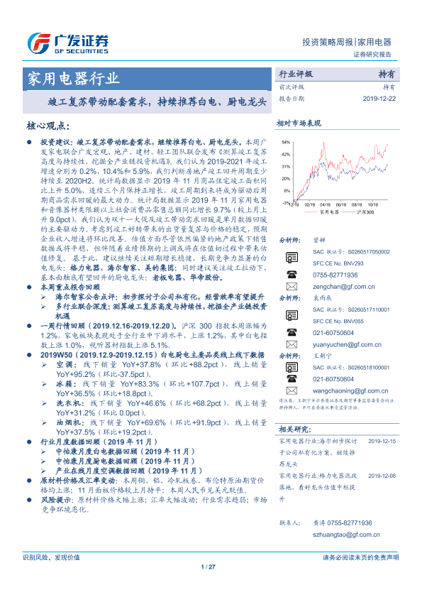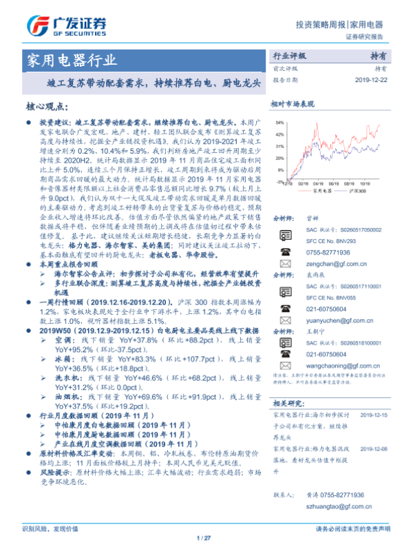 【广发证券】【20191222】家用电器行业投资策略周报:竣工复苏带动配套需求,持续推荐白电、厨电龙头-27页