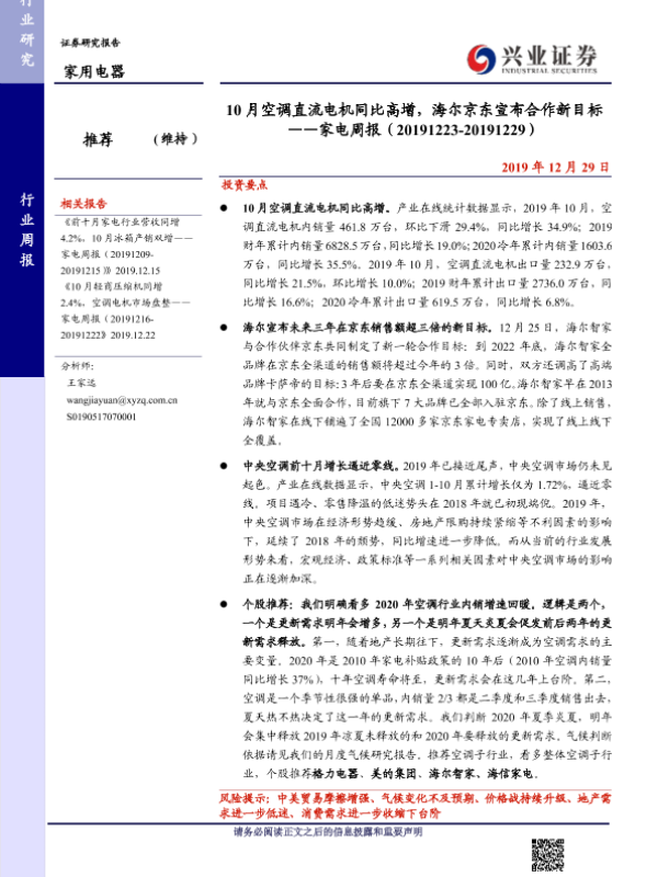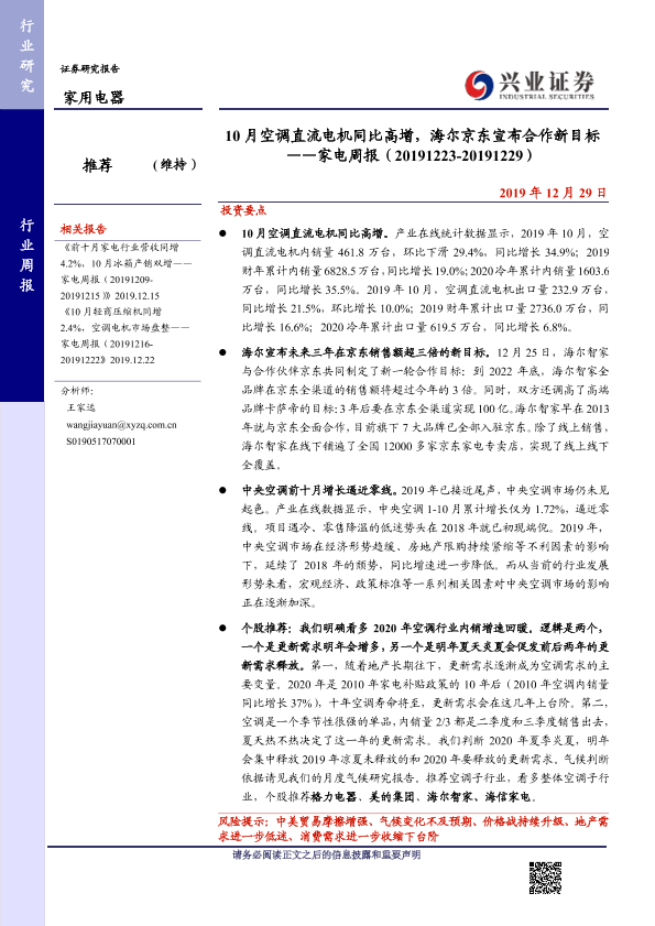 【兴业证券】【20191229】10月空调直流电机同比高增,海尔京东宣布合作新目标 ——家电周报(20191229-20191229)-10页