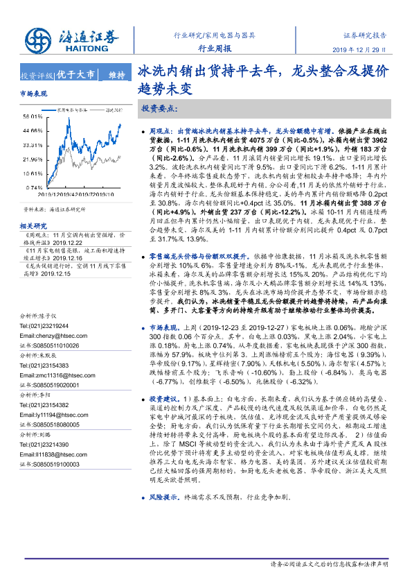 【海通证券】【20191229】家用电器与器具行业周报:冰洗内销出货持平去年,龙头整合及提价趋势未变-5页