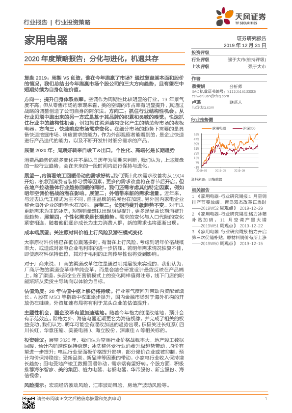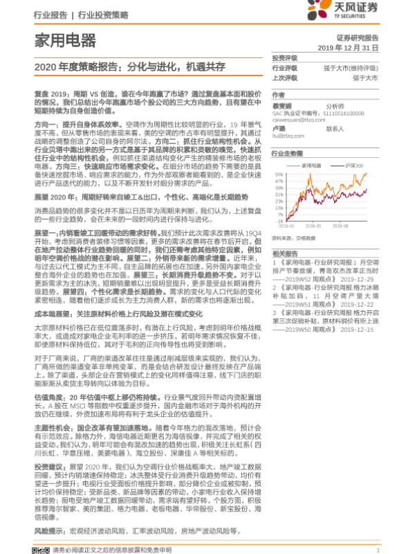 【天风证券】【20191231】家用电器2020年度策略报告:分化与进化,机遇共存-22页