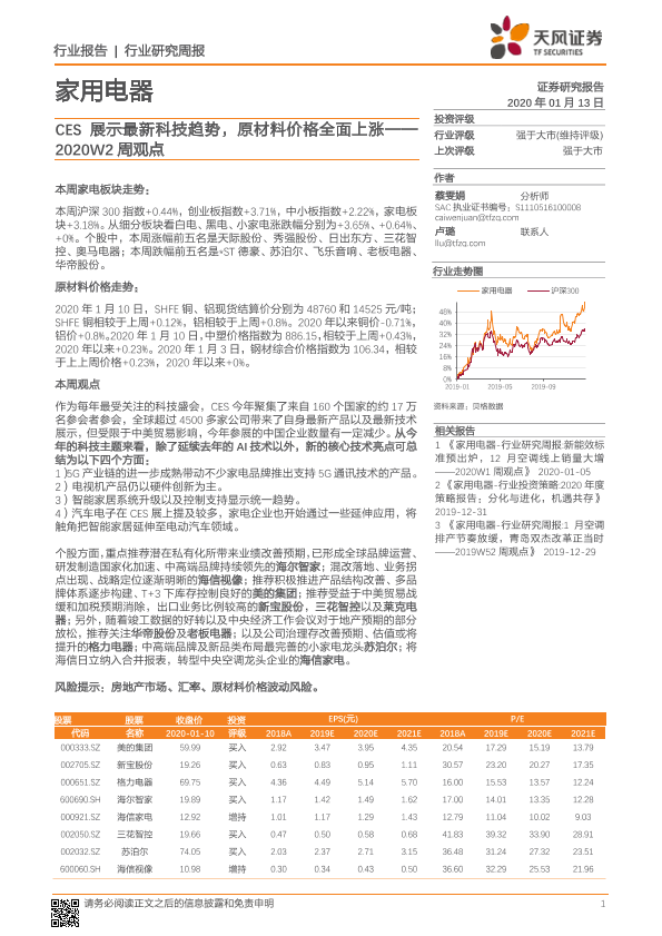【天风证券】【20200113】家用电器:2020W2周观点:CES展示最新科技趋势,原材料价格全面上涨-13页