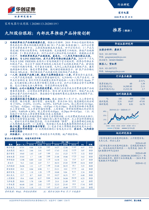 【华创证券】【20200119】家用电器行业周报:九阳股份跟踪:内部改革推动产品持续创新-15页