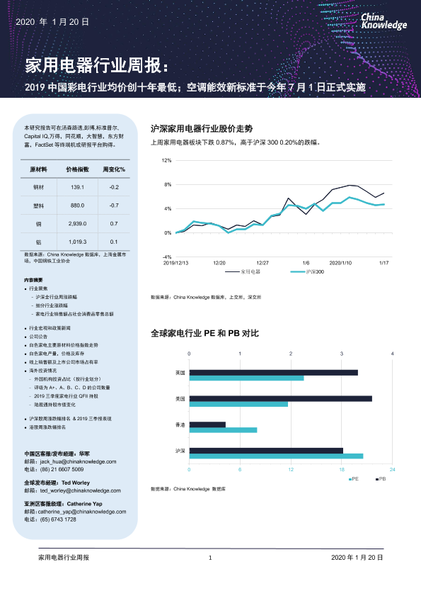 【China Knowledge】【20200120】家用电器行业周报:2019中国彩电行业均价创十年最低;空调能效新标准于今年7月1日正式实施-14页
