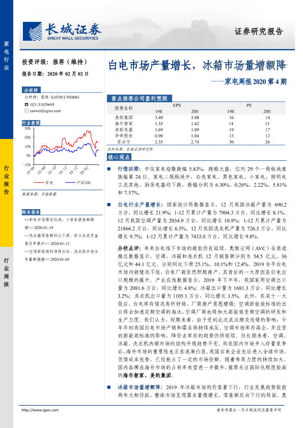 【长城证券】【20200202】20200202-长城证券-家电周报2020第4期:白电市场产量增长,冰箱市场量增额降-11页