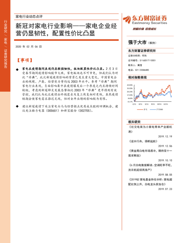 【东方财富证券】【20200206】20200206-东方财富证券-家电行业动态点评:新冠对家电行业影响——家电企业经营仍显韧性,配置性价比凸显-12页