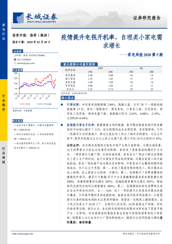 【长城证券】【20200209】家电周报2020第5期:疫情提升电视开机率,自理类小家电需求增长-11页