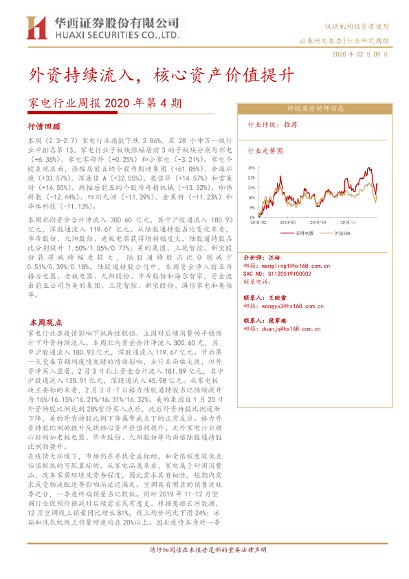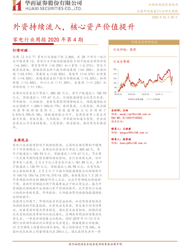 【华西证券】【20200209】家电行业周报2020年第4期:外资持续流入,核心资产价值提升-19页