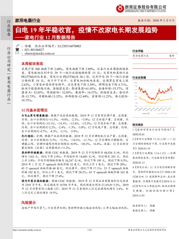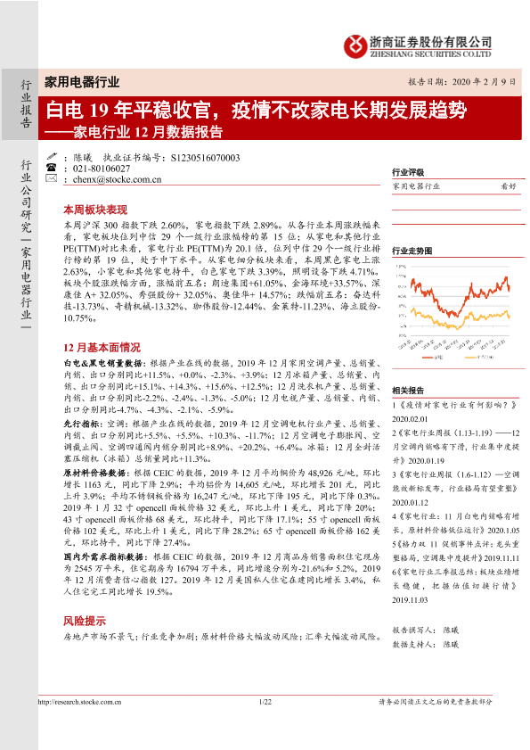 【浙商证券】【20200209】家电行业12月数据报告:白电19年平稳收官,疫情不改家电长期发展趋势-22页