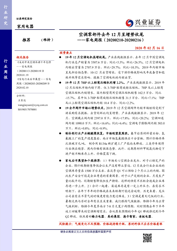 【兴业证券】【20200216】空调零部件去年12月呈增势收尾——家电周报(20200210-20200216)-8页