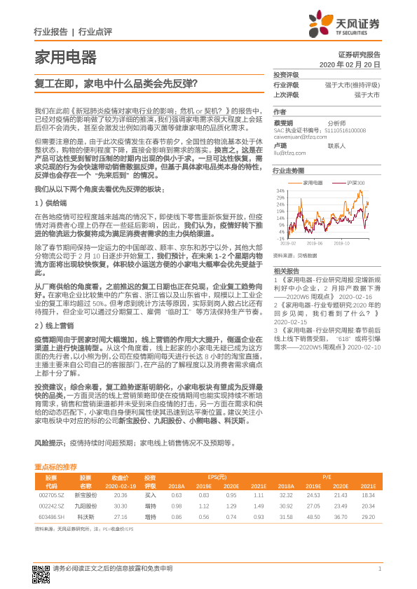 【天风证券】【20200220】家用电器行业点评:复工在即,家电中什么品类会先反弹?-5页