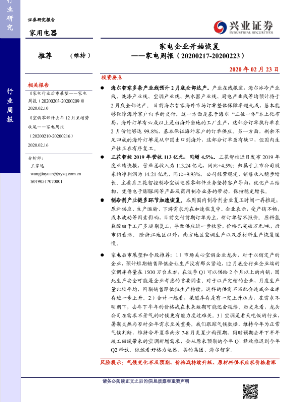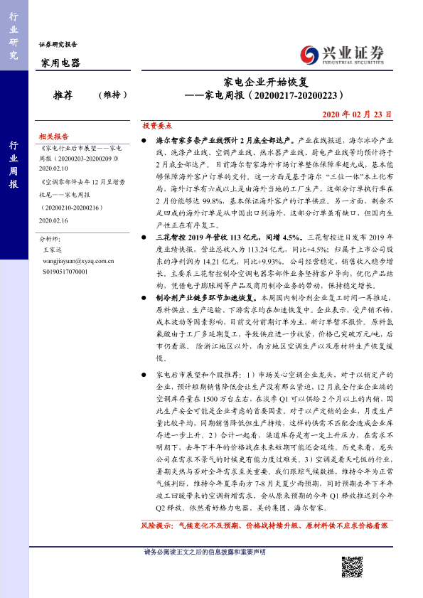 【兴业证券】【20200223】家电企业开始恢复——家电周报(20200217-20200223)-8页