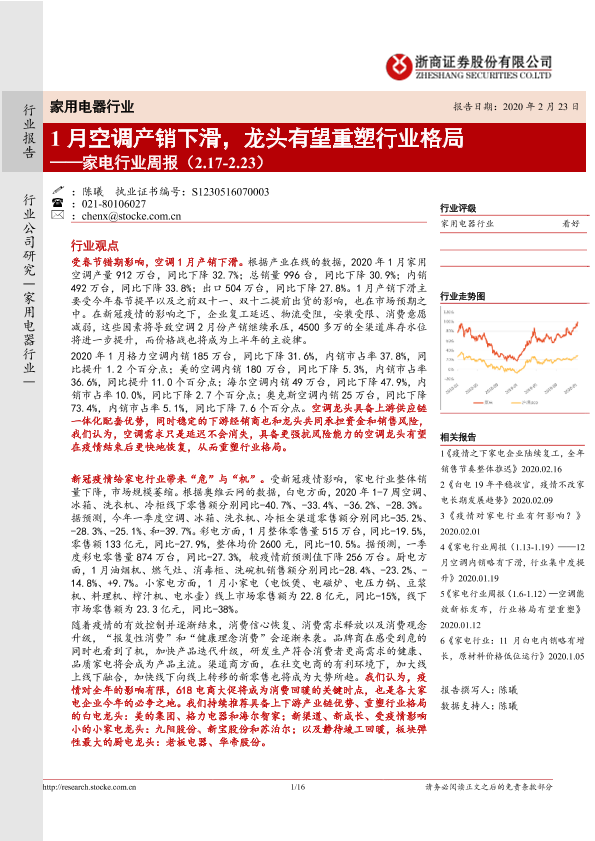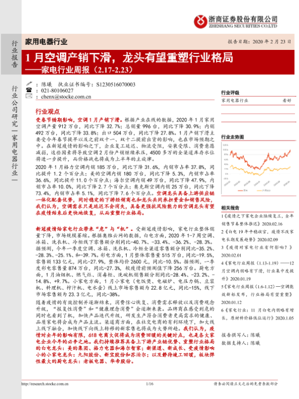 【浙商证券】【20200223】20200223-浙商证券-家电行业周报:1月空调产销下滑,龙头有望重塑行业格局-16页