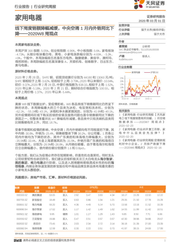 【天风证券】【20200301】家用电器2020W8周观点:线下周度销额降幅减缓,中央空调1月内外销同比下降-10页