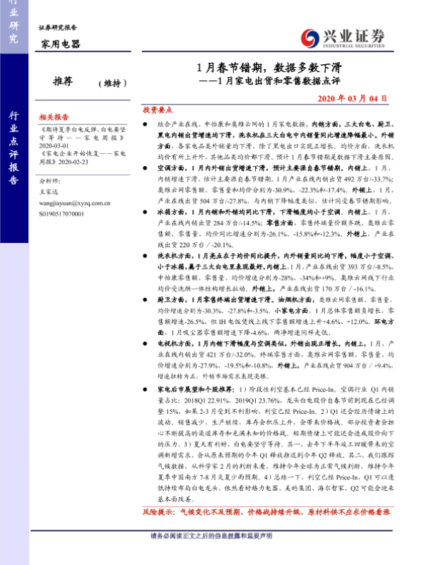 【兴业证券】【20200304】1月春节错期,数据多数下滑——1月家电出货和零售数据点评-14页