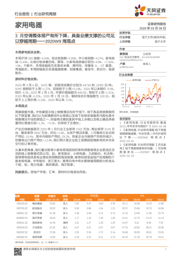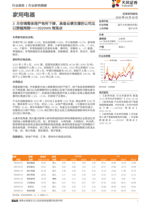 【天风证券】【20200309】家用电器2020W9周观点:3月空调整体排产有所下降,具备业绩支撑的公司足以穿越周期-12页