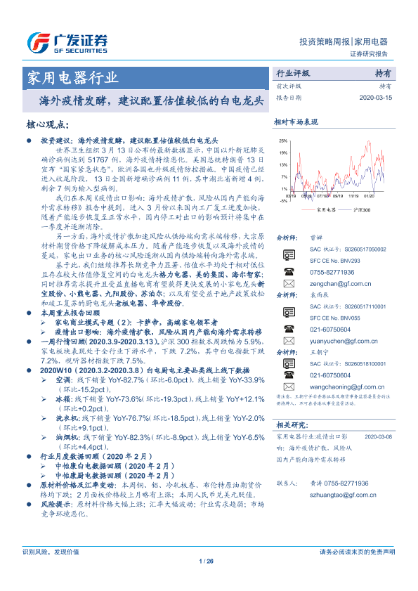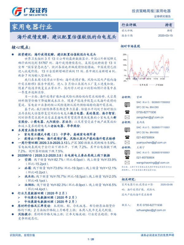 【广发证券】【20200315】20200315-广发证券-家用电器行业投资策略周报:海外疫情发酵,建议配置估值较低的白电龙头-26页
