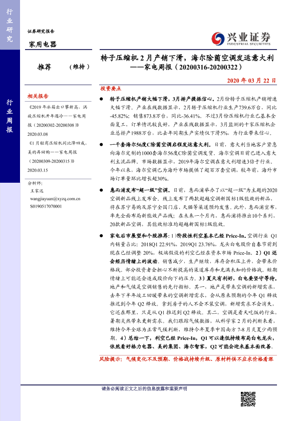 【兴业证券】【20200322】20200322-兴业证券-家电周报:转子压缩机2月产销下滑,海尔除菌空调发运意大利-8页