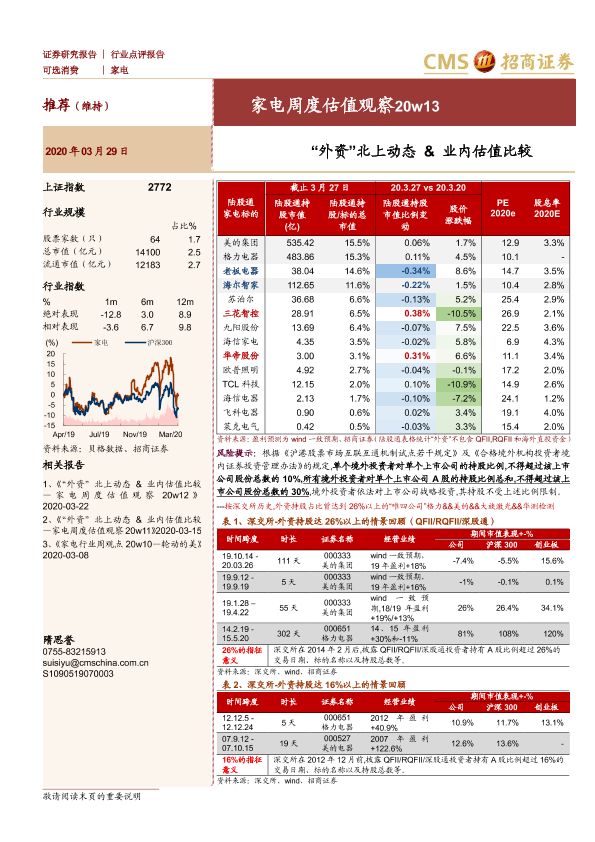 【海通证券】【20200329】家电周度估值观察20w13:“外资”北上动态&业内估值比较-4页