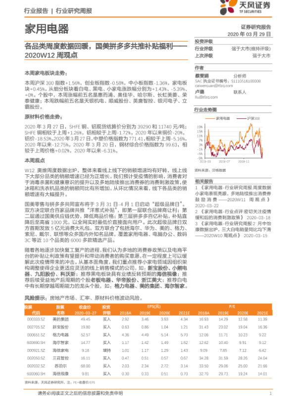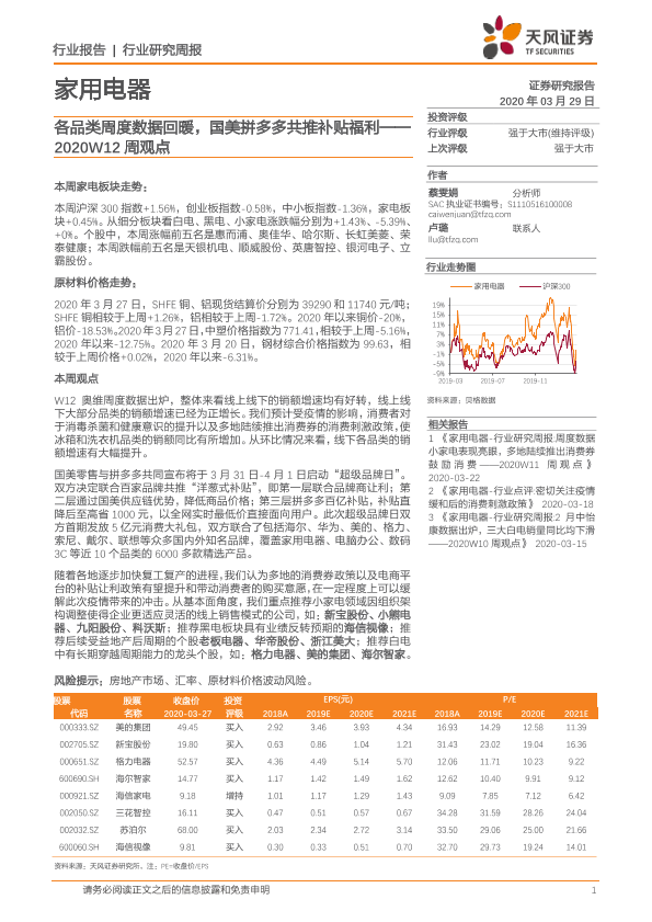 【天风证券】【20200329】家用电器2020W12周观点:各品类周度数据回暖,国美拼多多共推补贴福利-11页