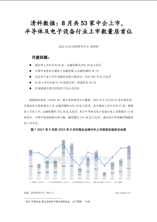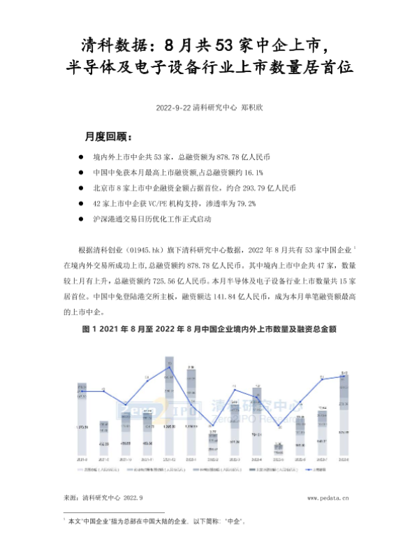 【清科研究中心】【20220922】清科数据:8月共53家中企上市,半导体及电子设备行业上市数量居首位-11页