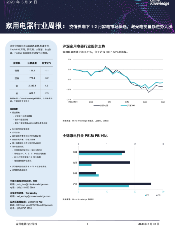 【China Knowledge】【20200331】家用电器行业周报:疫情影响下1-2月家电市场低迷,激光电视量额逆势大涨-13页