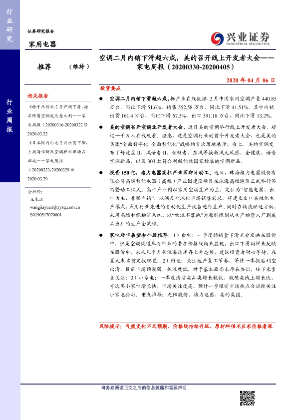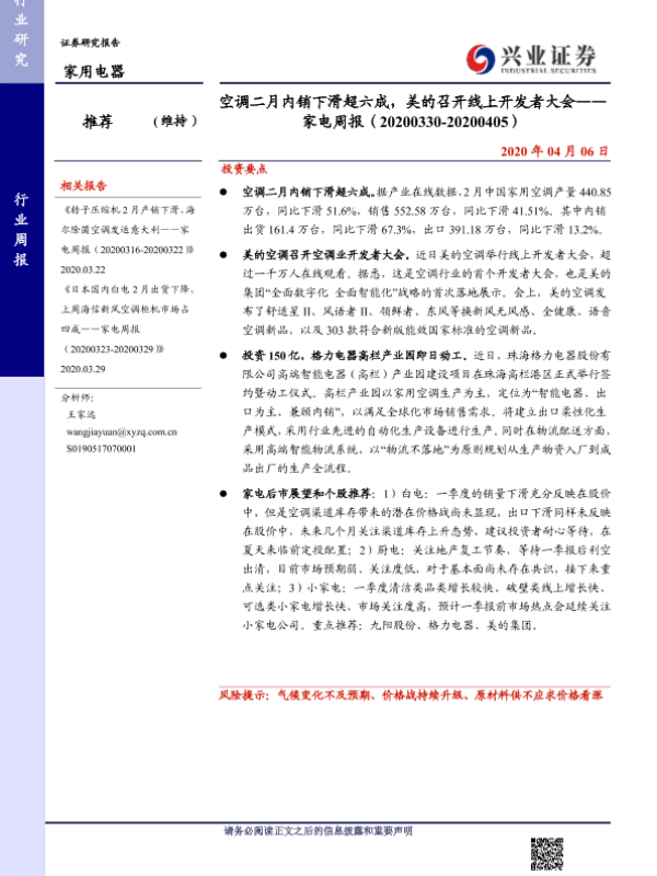 【兴业证券】【20200406】空调二月内销下滑超六成,美的召开线上开发者大会——家电周报(20200330-20200405)-8页