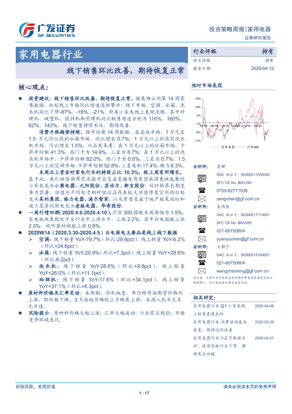 【广发证券】【20200412】家用电器行业投资策略周报:线下销售环比改善,期待恢复正常-17页