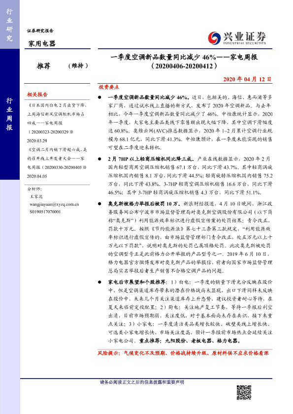 【兴业证券】【20200412】一季度空调新品数量同比减少46%——家电周报(20200406-20200412)-8页