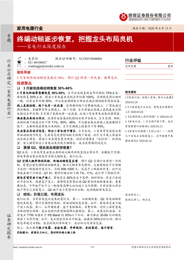 【浙商证券】【20200413】20200413-浙商证券-家电行业深度报告:终端动销逐步恢复,把握龙头布局良机-8页