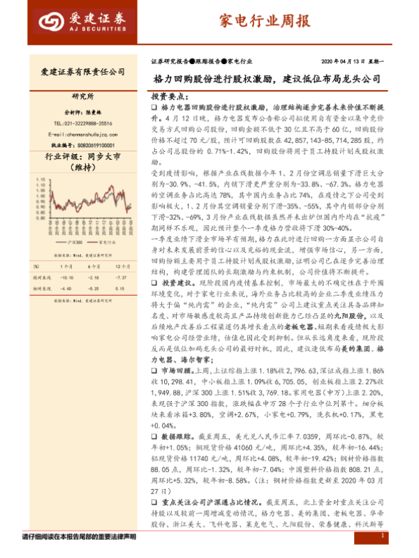 【爱建证券】【20200413】20200413-爱建证券-家电行业周报:格力回购股份进行股权激励,建议低位布局龙头公司-11页