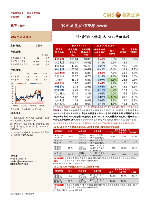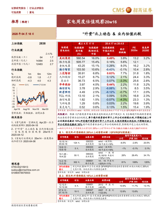【海通证券】【20200418】家电周度估值观察20w16:“外资”北上动态&业内估值比较-4页