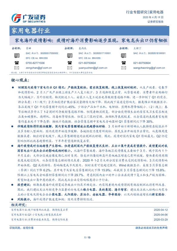 【广发证券】【20200419】家电海外疫情影响:疫情对海外消费影响逐步显现,家电龙头出口仍有韧性-13页