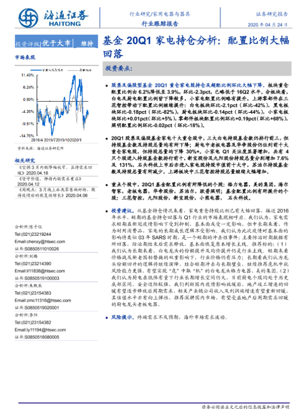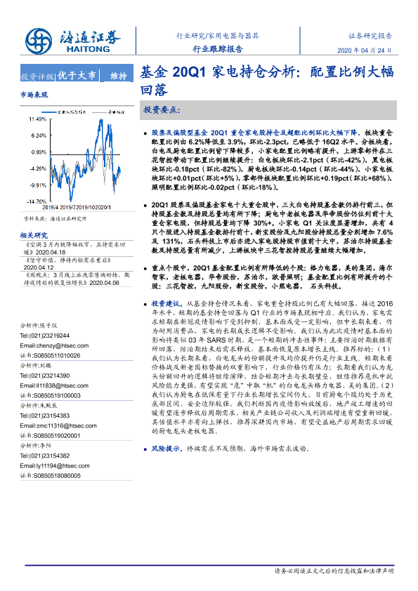 【海通证券】【20200424】家用电器与器具行业跟踪报告:基金20Q1家电持仓分析:配置比例大幅回落-9页