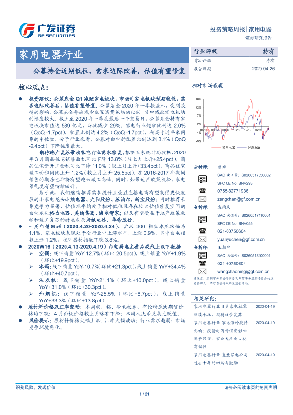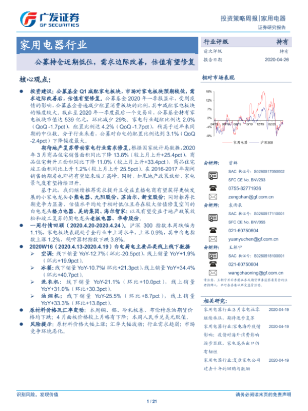 【广发证券】【20200426】家用电器行业:公募持仓近期低位,需求边际改善,估值有望修复-21页