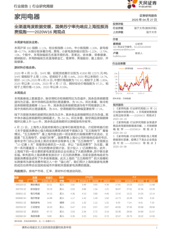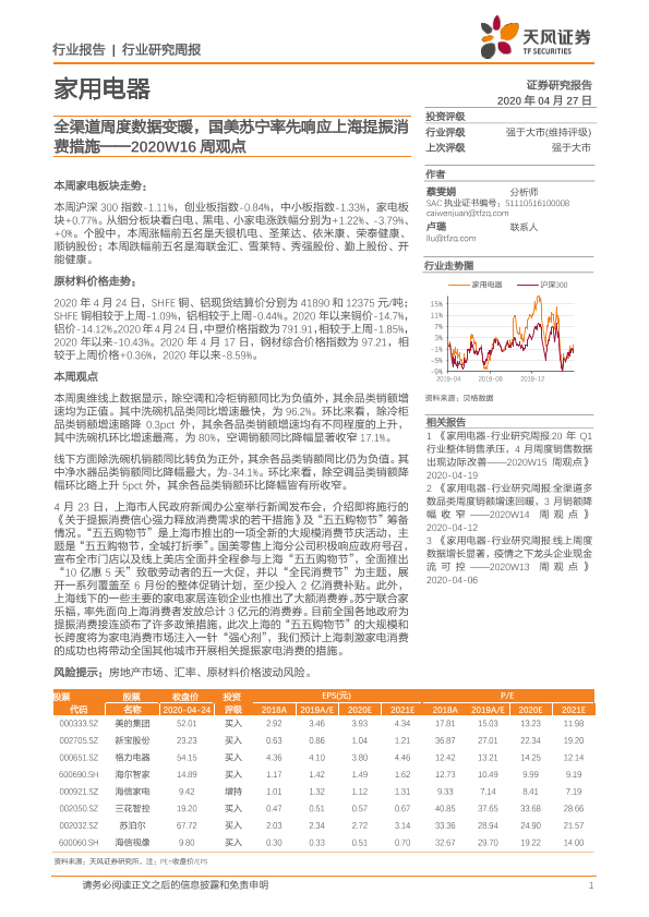 【天风证券】【20200427】家用电器2020W16周观点:全渠道周度数据变暖,国美苏宁率先响应上海提振消费措施-10页