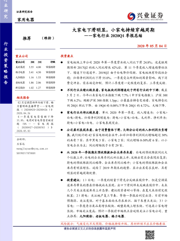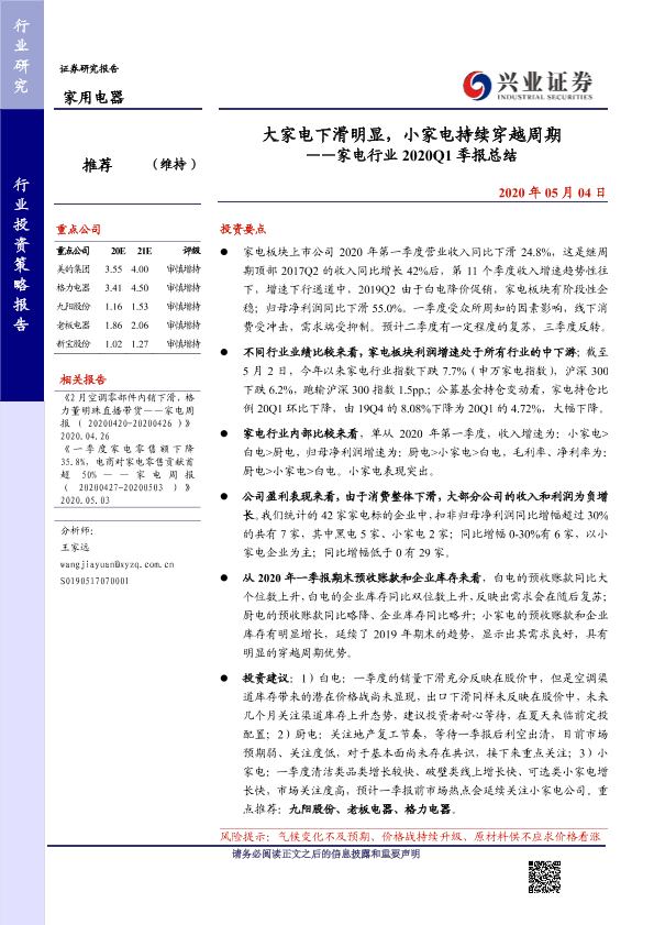 【兴业证券】【20200504】大家电下滑明显,小家电持续穿越周期——家电行业2020Q1季报总结-20页