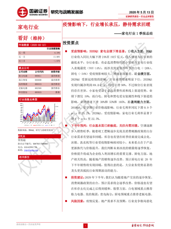 【国融证券】【20200513】家电行业1季报总结:疫情影响下,行业增长承压,静待需求回暖-12页