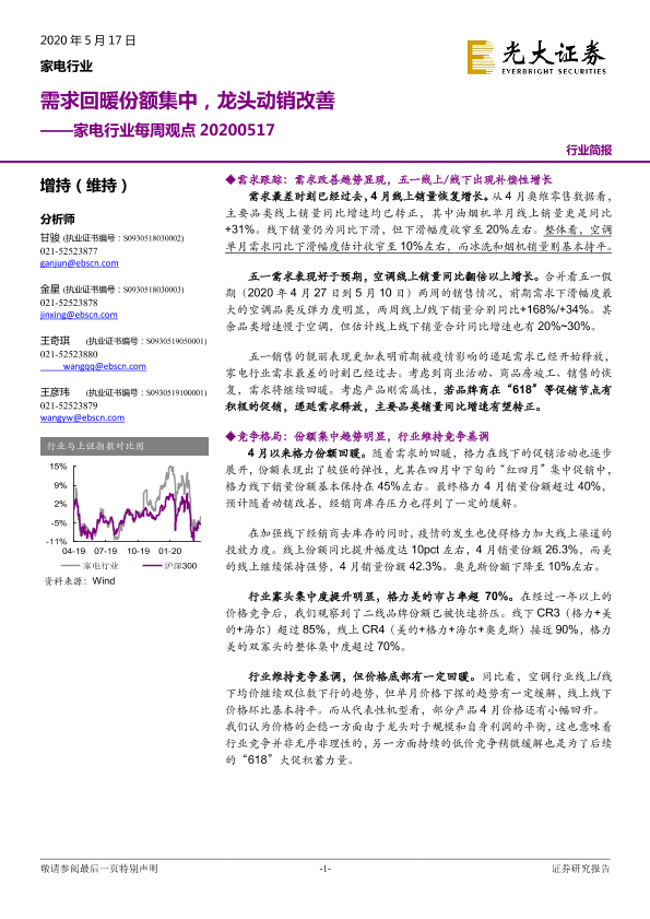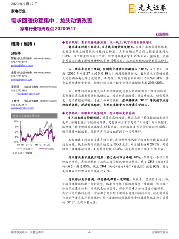【光大证券】【20200517】家电行业每周观点:需求回暖份额集中,龙头动销改善-6页