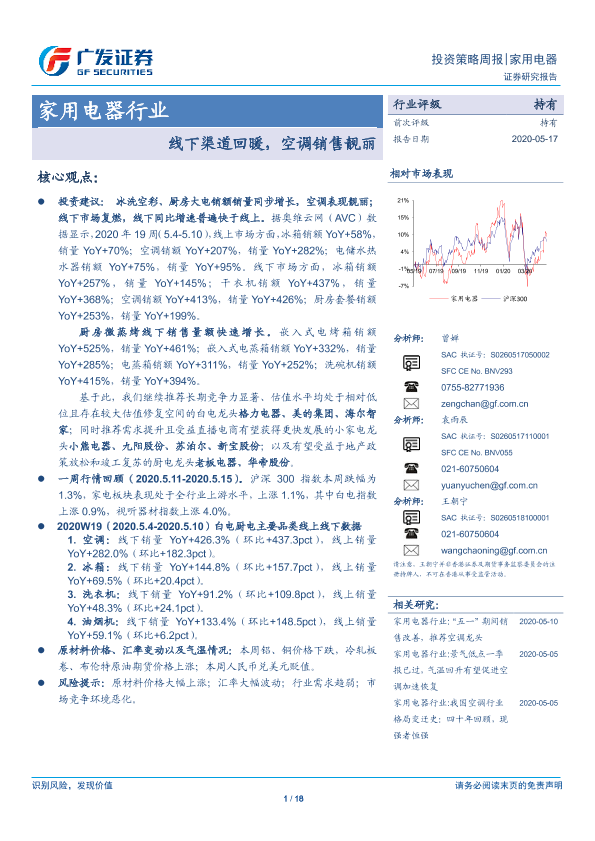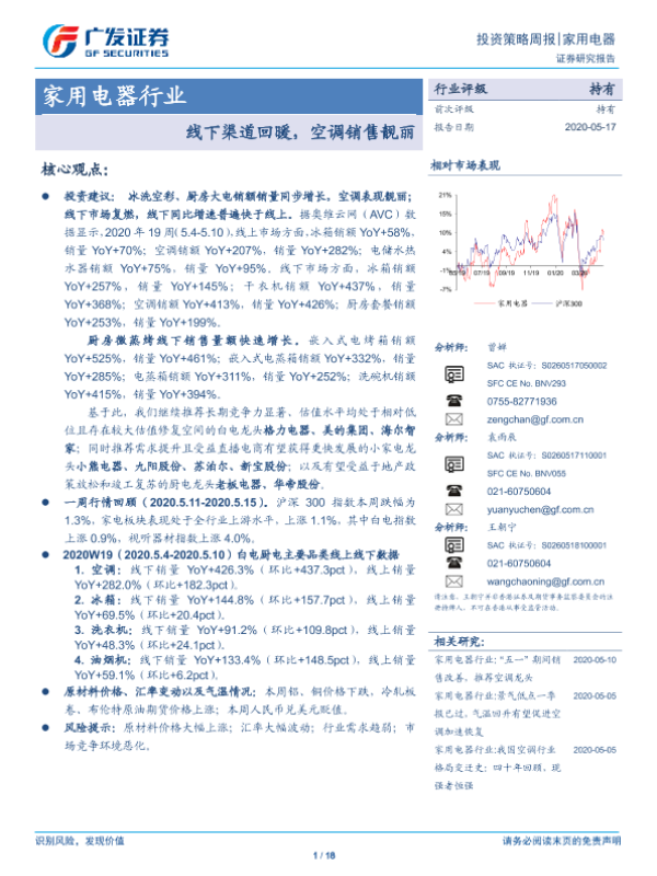 【广发证券】【20200517】家用电器行业投资策略周报:线下渠道回暖,空调销售靓丽-18页
