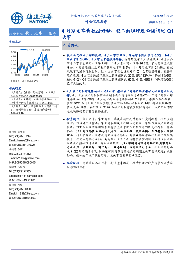 【海通证券】【20200518】家用电器行业信息点评:4月家电零售数据好转,竣工面积增速降幅相比Q1收窄-2页