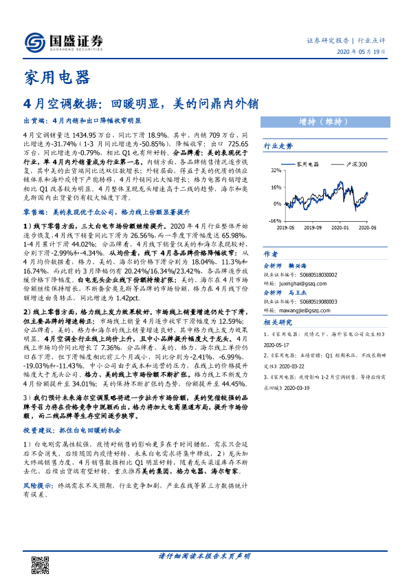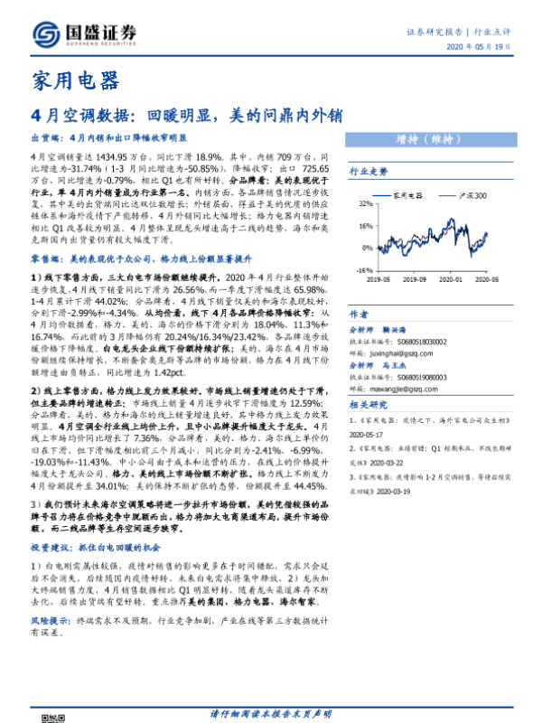 【国盛证券】【20200519】家用电器行业4月空调数据:回暖明显,美的问鼎内外销-8页