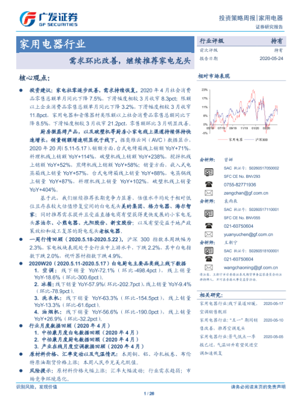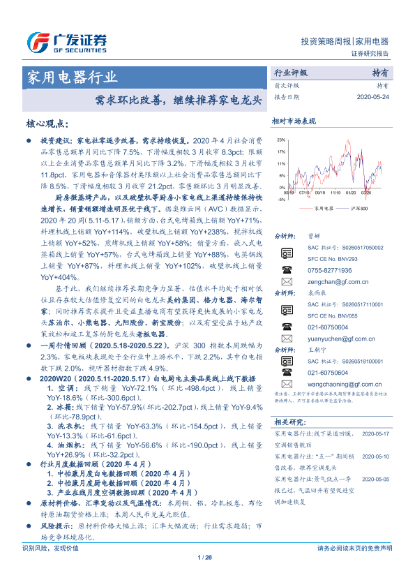 【广发证券】【20200524】20200524-广发证券-家用电器行业投资策略周报:需求环比改善,继续推荐家电龙头-26页