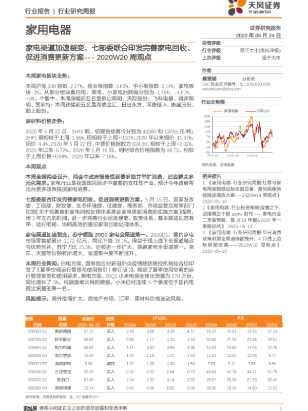 【天风证券】【20200524】家用电器2020W20周观点:家电渠道加速裂变,七部委联合印发完善家电回收、促进消费更新方案-12页