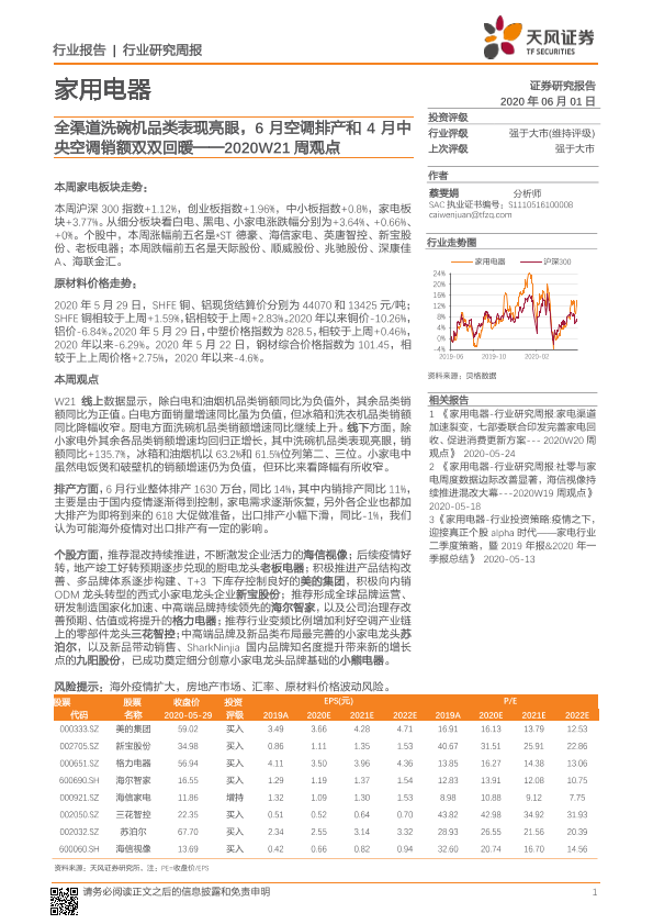 【天风证券】【20200601】家用电器2020W21周观点:全渠道洗碗机品类表现亮眼,6月空调排产和4月中央空调销额双双回暖-14页