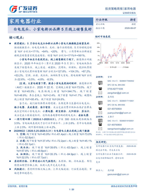 【广发证券】【20200607】家用电器行业投资策略周报:白电龙头、小家电新兴品牌5月线上销售良好-20页