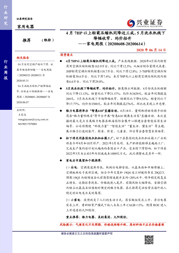 【兴业证券】【20200614】4月7HP以上轻商压缩机同降近三成,5月洗衣机线下降幅收窄、均价抬升——家电周报(20200608-20200614)-8页