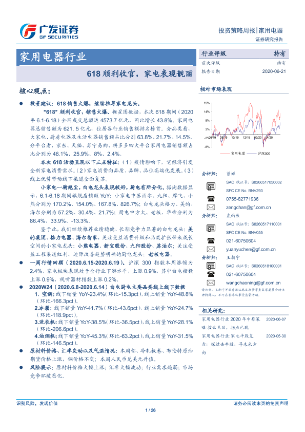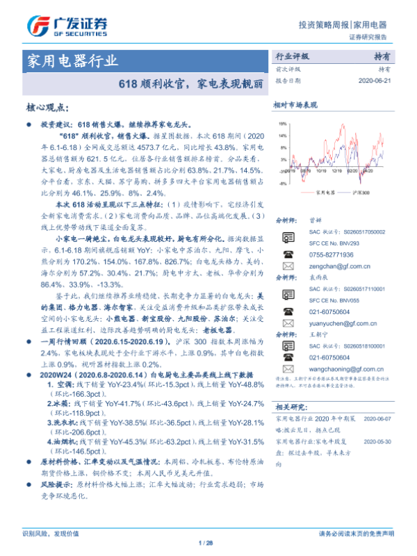 【广发证券】【20200621】20200621-广发证券-家用电器行业投资策略周报:618顺利收官,家电表现靓丽-28页