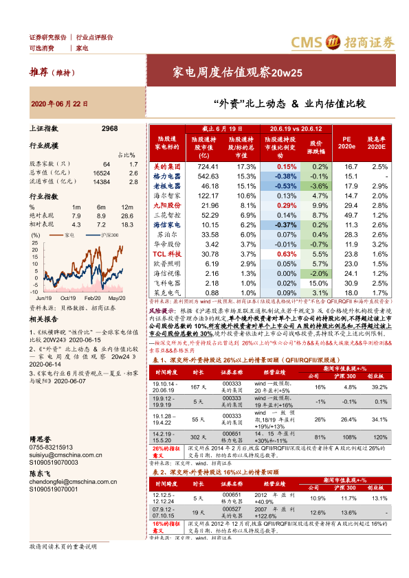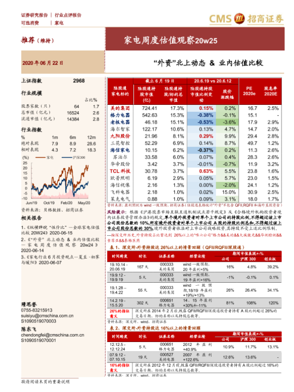 【海通证券】【20200622】家电周度估值观察20w25:“外资”北上动态&业内估值比较-3页