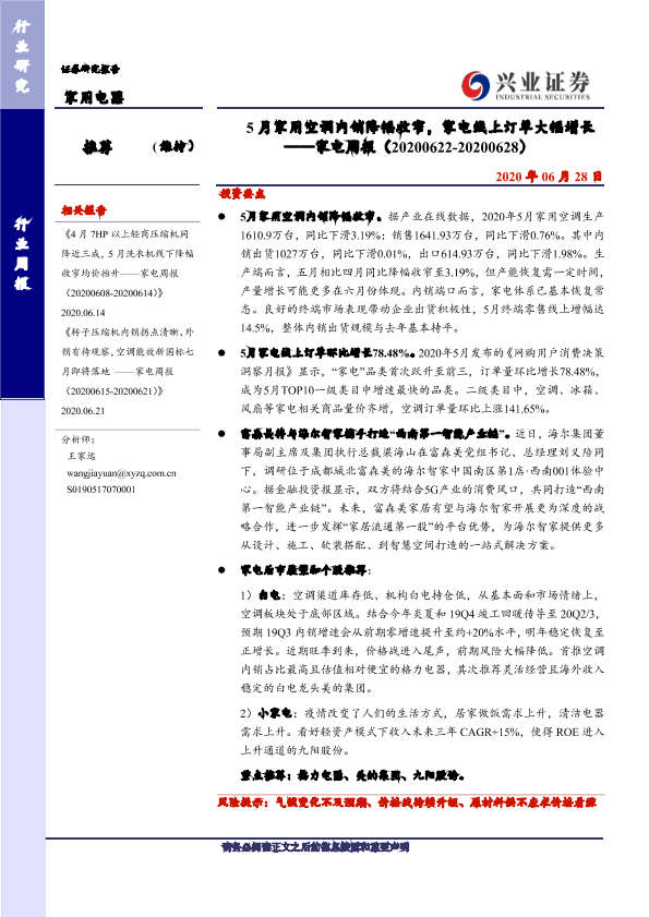 【兴业证券】【20200628】5月家用空调内销降幅收窄,家电线上订单大幅增长 ——家电周报(20200622-20200628)-8页